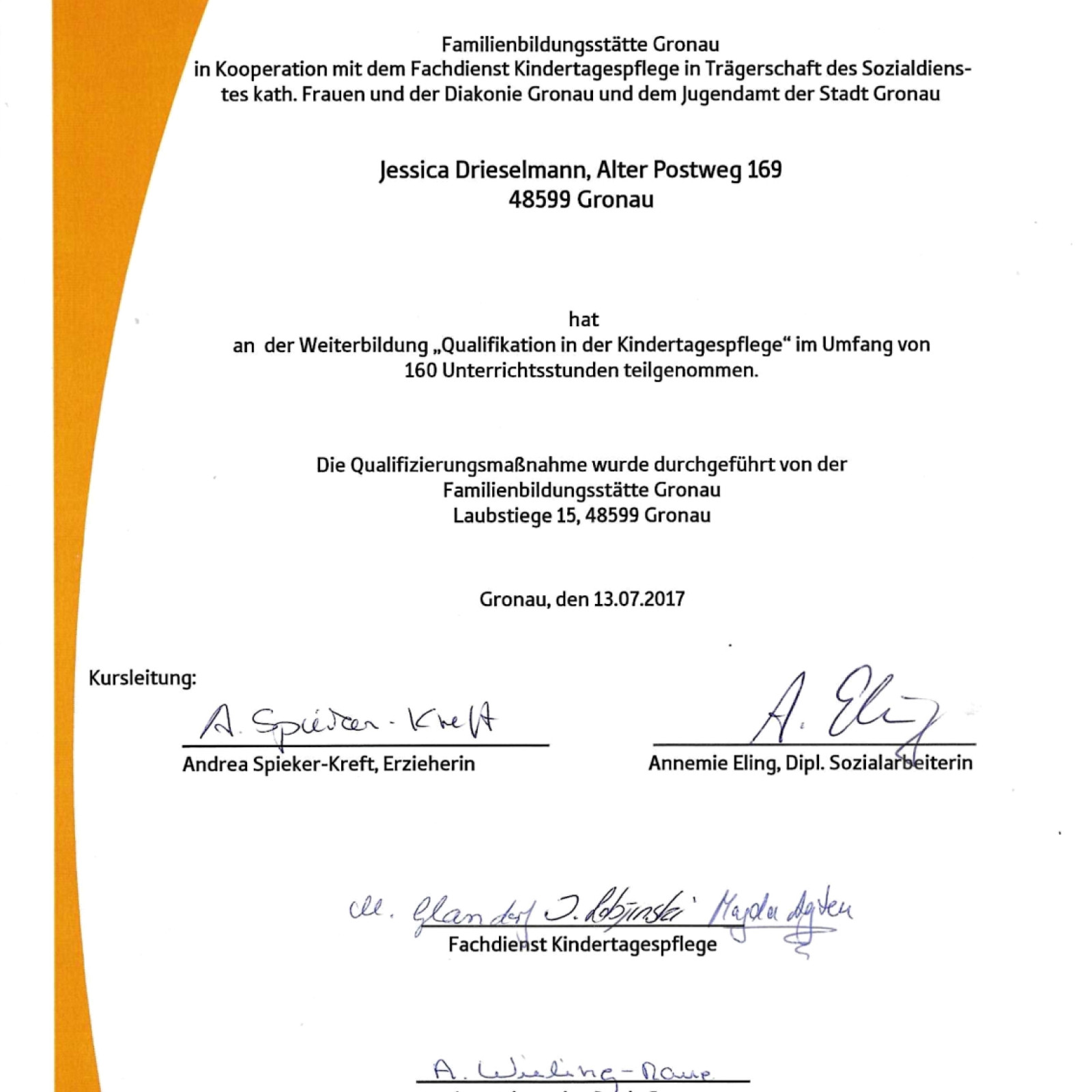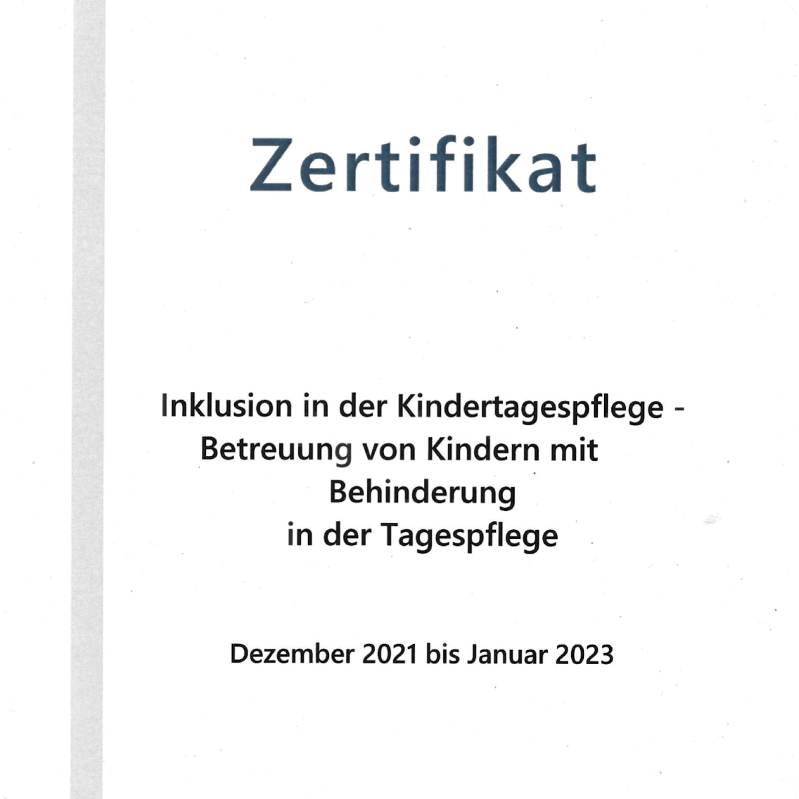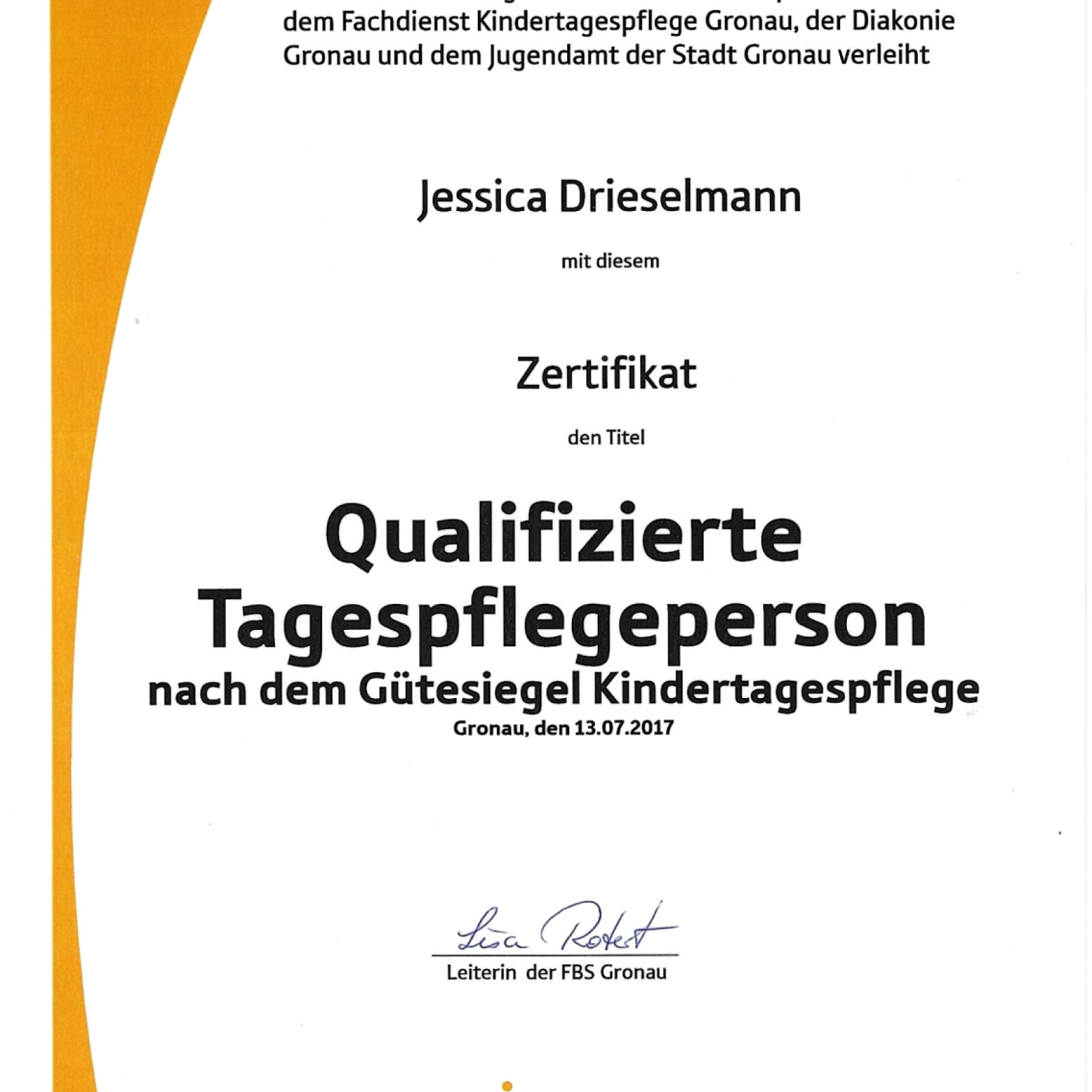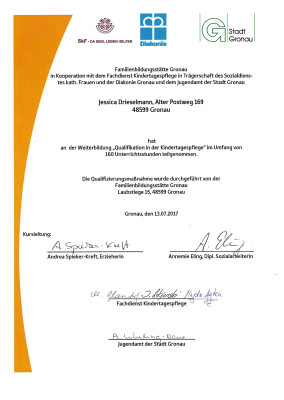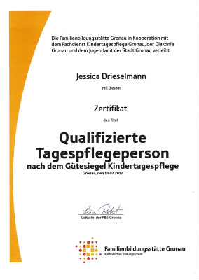 Ich bin seit 2017 als qualifizierte Kindertagespflegeperson mit viel Freude und Engagement tätig. Jeden Tag begleite ich Ihr Kind in seiner Entwicklung, wir unternehmen viele tolle Sachen, spielen, singen, basteln und haben Freude miteinander.